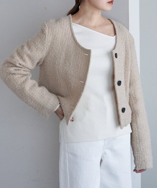 シーズンムード上がる1着!羽織るだけでトラッドな印象にしてくれるジャケット。コンパクトな丈感で、スタイルアップ効果も◎デニムと合わせて大人カジュアルに、ワントーンやモノトーンで合わせてモードに、様々なコーディネートを楽しめます。ほっこりとしたウールライク生地なので、しっかり暖かく、オンオフさまざまなシーンで活躍する優秀ジャケットです。- - - - - - - - - - - - - - -透け感:なし裏地:あり伸縮性:ややあり光沢感:なし生地の厚さ:普通- - - - - - - - - - - - - - -※撮影環境により、光の当たり具合で色味が違って見える場合があります。あらかじめご了承下さい。※画像はサンプルの為、実際にお届けする商品と仕様が異なる場合がございます。※中綿の細かな繊維が外側に飛び出ることがありますので毛玉取り器を使用してカットしてください。※パークロロエチレンによるドライクリーニングはお避け下さい。※ご家庭での洗濯は避け、専門のクリーニング店に出して下さい。※乾燥の初期は常温のタンブル乾燥を行ってください。※溶剤残留によるきわつきの発生にご注意ください。※毛玉が出来ましたら引っ張らずに小さなハサミで一つ一つ取り除いてください。※アイロンは当て布の上から低温でかけて下さい。※タンブル乾燥はお避け下さい。■「商品のお気に入り登録」でハートマークをクリックし、お好きなカラーを選んでお気に入りに登録すると入荷情報や残り1点の通知、完売カラーの再入荷、セール情報などを受け取ることができます。登録して頂いた商品だけが対象となる、あなただけのタイムセールが開催されることも!■「ブランドのお気に入り登録」で新商品や再入荷など、いち早くSHENERYのお得な情報を受け取ることができますので、ご登録をおすすめします!