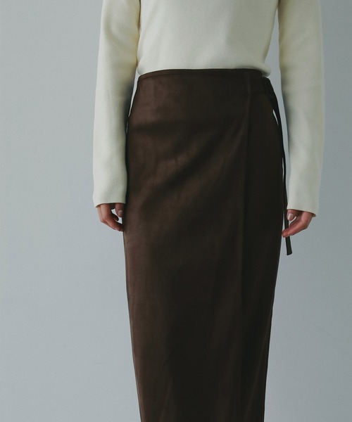 柔らかくしなやかな印象とIラインの洗練されたシルエットが特徴の、フェイクスエード素材のタイトスカート。 上品な光沢感をまとい、オトナな印象に格上げしてくれるアイテムです。 ラップ風デザインとサイドのスリットで、歩くたびに軽やかな表情を生みだします。 実際は縫い留められているため、はだける心配もなし。 ウエストにさりげなくあしらったベルト風ディテールがアクセントに。 トップスをインして着こなせば、より洗練された印象にまとまります。 すっきりとしたIラインシルエットながら、伸縮性のある生地とサイドのスリットで、動きやすさも◎ ウエストは後ろのみゴム仕様、バッグファスナーもついています。 女性らしいシルエットと快適な着心地、どちらも叶えてくれるスカートです。 秋冬っぽいスエード調素材で、季節の変わり目に取り入れるのもおすすめです。 【ATTENTION】 商品写真はできる限り現品を再現するように心がけていますが、ご利用のモニターにより差異が生じます。サイズや重さなどに多少の個体差が生じる場合がございます。製品の仕様およびデザインは改善等のため、予告なく変更する場合がございます。