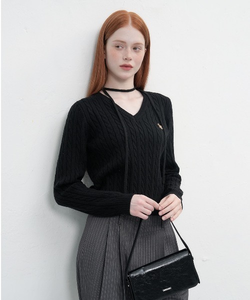 [DESIGNER COMMENT]クラシックなケーブル編みのウールVネックニットプルオーバースタンダードシルエットでバスト元のロゴメタルがポイント。10%ウール混合で保温性に優れ柔らかい肌触り。パンツからスカートまでボトムを選ばず活躍します。[DETAIL INFO]伸縮性:あり裏地:なし透け感:なし厚さ:やや厚い[WASHING TIP]ドライクリーニング※洗濯の際は、製品のケアラベルに従ってください。