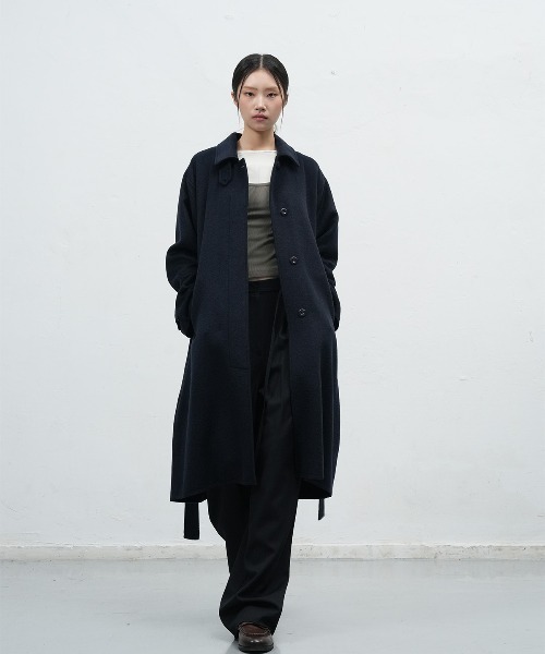 [DESIGNER COMMENT]大人な美シルエットが魅力のバルマカンシングルハンドメイドロングコート。ラグラン袖で厚手のニットもすっきり着用。ウール混合素材で軽くて保温性に優れている。襟を立てて着用も可能。ミニマルさを演出し、こだわりポイントが詰まった1着。[DETAIL INFO]伸縮性:なし裏地:あり透け感:なし厚さ:やや厚い[WASHING TIP]ドライクリーニング※洗濯の際は、製品のケアラベルに従ってください。