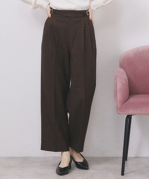 着脱のしやすさと美しいシルエットがポイントのグルカワイドパンツ センタープレスや立体感のあるタックで、程よくきちんとした印象をプラスしたデザイン 【デザイン】 ・フロントのセンタープレスが脚をまっすぐに見せ、美脚効果を狙える上品な仕上がり。 ・ウエスト部分にはグルカ風のバックルを施し、程よいアクセントとトレンド感をプラス。 ・タックディテールを取り入れることで立体感が生まれ、広がりすぎないワイドシルエットを実現。 後ろウエストはゴム仕様で着脱も快適です。 ・股上の深さとワイドシルエットがリラクシーな履き心地を実現しつつ、きちんと感も両立。 【素材】 ・軽やかな履き心地が魅力。程よくしなやかで動きやすく、長時間の着用でもストレスフリーです。 ・防シワ性で美しいシルエットをキープし、イージーアイロンの機能でお手入れも楽々。 ・マシンウォッシャブル仕様で日常使いしやすいのはもちろん、抗ピリング加工により長く愛用できるのもポイントです。 【仕様】 ・ポケット数:横×2 後ろ×2 ・左脇ファスナー ・ウエスト後ろゴム ・裏地なし ※照明の関係により、実際よりも色味が違って見える場合があります。また、パソコン・スマートフォンなどの環境により、若干製品と画像のカラーが異なる場合もございます。 モデル情報:身長163cm B81 W56 H82 着用サイズ:38(M) 店舗へのお問い合わせ商品番号:C58-64011 ●製品寸法: 36(S):W52~62cm H82cm 股下60cm 前股上33cm 渡り幅29cm 裾幅22cm 38(M):W56~66cm H84cm 股下61cm 前股上33cm 渡り幅30cm 裾幅23cm 40(L):W60~70cm H86cm 股下62cm 前股上34cm 渡り幅31cm 裾幅24cm 42(LL):W64~74cm H88cm 股下63cm 前股上35cm 渡り幅33cm 裾幅25cm 備考: