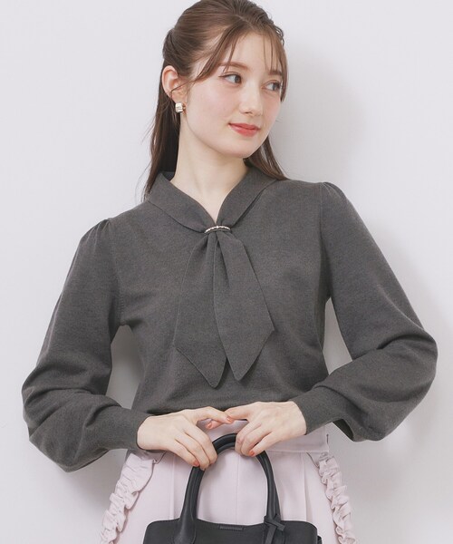 ボウタイにフェイクパールとビジューがミックスになったゴールドパーツが顔周りに華やぎを与えてくれるデザインニット【デザイン】・ボウタイ風の華やかなデザインニット。・タブの部分に着映えるコールド×フェイクパールのパーツがあしらわれていて、顔周りに華やぎを与えてくれます。・トレンドの繊細なラメ混と、ラメ無し、バイカラーのアソート展開で、TPOに合わせてコーディネイトしていただけます。・すっきりとコンパクトなシルエットに、ふんわりとした程良いボリューム袖もポイント。・ボウタイはタック風に差し込んだりラフに差し込むことで表情に変化が出ます。・リモートワークや通勤、ちょっとしたお出かけにもオススメの一枚です。【素材】・膨らみのある暖かな毛混の4者混の糸を使用。・ラメ混とラメなしの展開で、どちらも風合いが柔らかく肌触りの良いのも嬉しいポイント。・マシンウォッシャブル機能付きで、ご自宅で簡単にお手入れしていただけます。【カラー】グレージュ(650)、ブルー(691)、グレー(812)、ライトピンク(870)、サックスブルー(890)のカラーにはラメが入っております。※照明の関係により、実際よりも色味が違って見える場合があります。また、パソコン・スマートフォンなどの環境により、若干製品と画像のカラーが異なる場合もございます。モデル情報:身長163cm B81 W56 H82 着用サイズ:38(M)店舗へのお問い合わせ商品番号:C58-14013●製品寸法:34(XS):着丈51cm B72cm 袖丈56cm 肩幅29cm36(S):着丈52cm B76cm 袖丈57cm 肩幅30cm38(M):着丈53cm B80cm 袖丈58cm 肩幅31cm40(L):着丈54cm B84cm 袖丈59cm 肩幅32cm42(LL):着丈55cm B88cm 袖丈60cm 肩幅34cm備考: