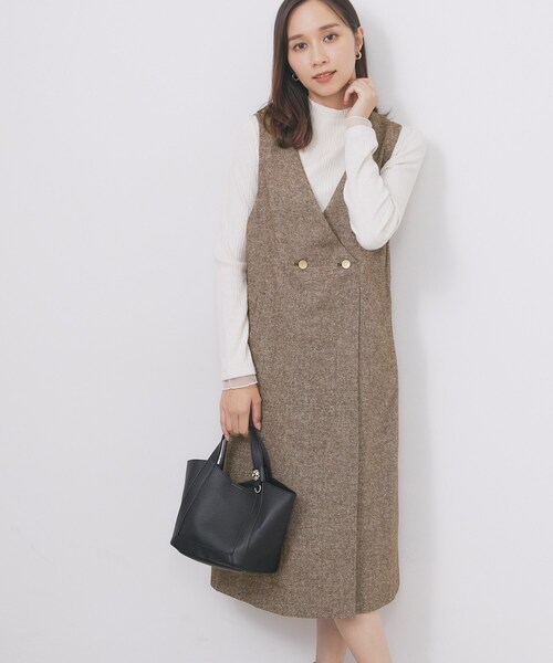 ラップデザインと上品な素材感が魅力のジャンパースカート【デザイン】・ウエストを引き立てるラップ風のシルエットが、女性らしい美しいラインを演出。・ゴールドボタンが控えめなアクセントに。シンプルながらディテールにこだわった一着です。・深めのVネックデザインは顔まわりをすっきり見せ、インナー次第でカジュアルにもフォーマルにも対応。・膝下丈で安心感と上品さをプラス。デイリーにはスニーカー、 オフィスにはパンプスを合わせるとシーンに合わせた着こなしが楽しめます。【素材】・防シワ機能付きの高密度素材が、長時間の着用でも美しくきちんと感をキープ。・ラメツィードは品のある控えめな光沢が特徴。落ち着いたおしゃれ感を引き立てます。・マシンウォッシャブル対応で、お手入れの手間を軽減。忙しい毎日にもぴったりです。【仕様】・ポケット数:横×2・左脇ファスナー・裏地あり※照明の関係により、実際よりも色味が違って見える場合があります。また、パソコン・スマートフォンなどの環境により、若干製品と画像のカラーが異なる場合もございます。モデル情報:身長163cm B81 W56 H82 着用サイズ:38(M)店舗へのお問い合わせ商品番号:C58-54020●製品寸法:36(S):総丈107cm B91cm 肩幅36cm W90cm H102cm38(M):総丈108cm B94cm 肩幅36cm W92cm H104cm40(L):総丈110cm B97cm 肩幅37cm W94cm H107cm42(LL):総丈112cm B100cm 肩幅38cm W96cm H110cm備考: