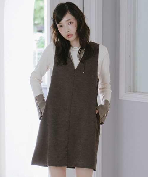 ■1枚で着回し自在な万能ジャンスカ■ 着るだけでコーデが完成するジャンスカです。 深めのVネックがデコルテをすっきり見せ、女性らしい印象をプラスします。 どんなインナーにも合わせやすく、合わせるトップス次第で雰囲気が変わるのも魅力。 前後2way仕様で、ZIPを前にするとカジュアルな着こなしも楽しめます。 ミニ丈なのでロングブーツと合わせても可愛く着こなせます。 色々な着方が楽しめる、1枚持っておきたい万能アイテムです。 ーーーーーーーーーーーーーーー 透け感:なし 裏地:あり 伸縮性:なし 光沢感:なし 生地厚さ:普通 洗濯方法:洗濯可 ※詳しいお手入れ方法は商品についているタグをご覧ください ーーーーーーーーーーーーーーー ※ご利用のモニター環境により、実際の色味と多少異なる場合がございます。 … information … 欲しいitemをお気に入り登録(♡マークをclick) ・お買いのがし対策…完売itemの再入荷やラスト1点の情報をお知らせ ・欲しいitemをお得にget…pricedownになったらいち早くお知らせ ・スムーズ検索…ZOZOのお気に入りアイテムページで簡単checkできるから、再検索不要♪