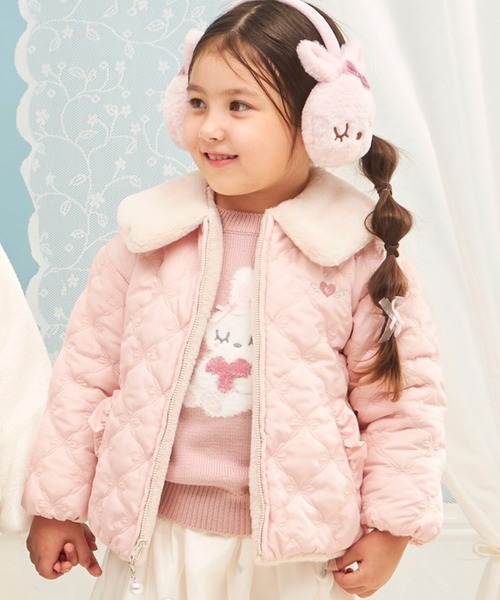 大きな衿のデザインが可愛いらしいフェイクファーのジャケット。裏地は、リボンを模したパターンの中わたキルトで、リバーシブル仕様。裏返すとフェイクファーの衿の付いたキルティングジャケットとしても着られます。ファスナーの引手に、パール調のチャームが付いているのも、魅力的なポイント。2WAYで楽しめるから、コーディネートの幅も広がります。