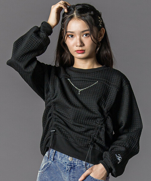 -25AW- 立体感フクレジャガードでちょい上級オシャ見え。 ■デザイン 前ドロストでウエストラインをきゅっと調整できる、バランス上手なトレーナー。 袖口には小さなロゴ刺しゅう、さりげなくZIDDY感をプラス。 チャーム付きデザインだから、通学コーデも放課後スタイルも華やか見え。 ホワイトはふんわり柔らかトーンでフェミかわ、ブラックはクールにキメたい日にも◎。 どちらも“森ガール”の透明感とY2Kムードが絶妙ミックス。 ■素材/機能 表面に立体感のあるフクレジャガード素材を使用し、存在感のある仕上がりに。 ポリエステルベースで軽く、動きやすく、シワになりにくいのも嬉しいポイント。 ほんのりストレッチ入りで着心地らくちん、デイリー使いにもぴったり。 程よい厚みとハリ感で、秋冬の重ね着スタイルに映える。 見た目も手触りもふんわりリッチでトレンド映え確実。 見た目も手触りもふんわりリッチでトレンド映え確実。 ※ネックレス付き(取り外し可能) 25秋冬アイテム 【ZIDDY(ジディー)】 ~teen Lady~ レディーストレンドを取り入れた クールでちょっぴり上品なスタイルを提案。