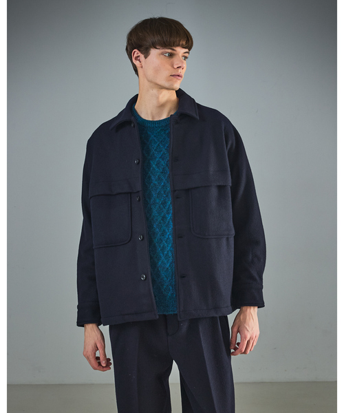 【素材】ウール高混率のツイード素材をベースに、生地表面を細かく毛羽立たせたミルド加工を施した一着。ライトメルトンのようなハリ感がありながら、柔らかなタッチが実現。ウール本来の保温性や防寒性が、秋冬ムードに馴染みます。【デザイン】ボックスシルエットに近いシャツブルゾン。アームホールを作らずドルマンタイプの設計にすることで、丸みが生まれ肩の力が抜けた雰囲気に。たっぷりめのシルエットが大人の余裕を演出します。ミニマルに仕上げながらポケットディテールでアクセントを。脇にはシーム利用のポケットを配置しています。【コディネート】同素材のワイドパンツ(品番:00510059001)とのセットアップでの着用がおススメ。デニムやワイドパンツなどと合わせたラフなカジュアルスタイルはもちろん、スラックスと合わせた綺麗目スタイルにもマッチします。※撮影画像は、光の当たり具合で色味が多少異なって見える場合があります。商品の色味は素材詳細画像をご参照ください。