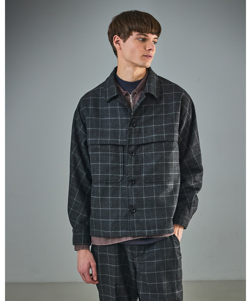 【素材】ウールを思わせるハリ感とタッチ感のポリエスルベース素材。ウインドペンとグレンチェックをミックスしたオリジナルチェック柄です。【デザイン】ボックスシルエットに近いシャツブルゾン。アームホールを作らずドルマンタイプの設計にすることで、丸みが生まれ肩の力が抜けた雰囲気に。たっぷりめのシルエットが大人の余裕を演出します。背ヨークは生地の取り方向を斜めに変え、バックスタイルも様になるよう拘りました。ミニマルに仕上げながらポケットディテールでアクセントを。脇にはシーム利用のポケットを配置しています。【コディネート】同素材のワイドパンツ(品番:00510059101)とのセットアップでの着用がおススメ。デニムやワイドパンツなどと合わせたラフなカジュアルスタイルはもちろん、スラックスと合わせた綺麗目スタイルにもマッチします。※撮影画像は、光の当たり具合で色味が多少異なって見える場合があります。商品の色味は素材詳細画像をご参照ください。