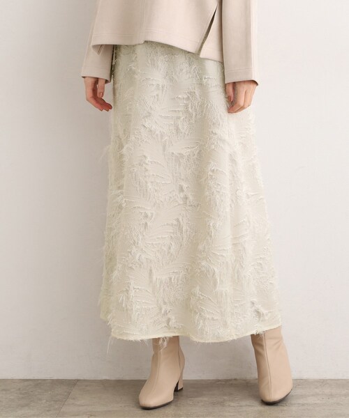 纏うだけで気分が華やぐ、主役級シャギースカート 【デザイン】 華やかなシャギージャカード素材で仕立てたスカート。 腰周りをすっきり見せるファスナー開き仕様と、広がりすぎないAラインシルエットで上品に着こなせます。 立体感のある素材感が存在感を放ち、シンプルなトップスを合わせるだけでトレンド感のあるスタイルに仕上がります。 【素材】 ふんわりとしたシャギーの毛足が特徴のジャカード素材を使用。 光の加減でニュアンスが生まれる表情豊かな素材感が、シーズンムードを高めてくれます。 柔らかくも程よいハリ感があり、シルエットを美しくキープ。 イベントシーンにも映える華やかさが魅力です。 【スタイリング】 ベーシックなニットやカジュアルなスウェットを合わせるだけで、旬の華やかスタイルが完成。 ヒールを合わせてレディに、ショートブーツを合わせてモードにと、幅広いシーンで着こなしを楽しめます。 【仕様】 ・ポケットなし ・左脇ファスナー ・ウエスト後ろゴム ・裏地あり ※こちらの商品はやや透け感があります。 ※照明の関係により、実際よりも色味が違って見える場合があります。また、パソコン・スマートフォンなどの環境により、若干製品と画像のカラーが異なる場合もございます。 【25AW】【26SS】 モデル情報:身長166cm B80 W59 H86 着用サイズ:02(M) 店舗へのお問い合わせ商品番号:768-74029 ●製品寸法: 01(S):W67cm H97cm 総丈86cm 02(M):W70cm H100cm 総丈88cm 03(L):W73cm H103cm 総丈90cm 04(LL):W76cm H106cm 総丈92cm 05(3L):W79cm H109cm 総丈92cm 備考: