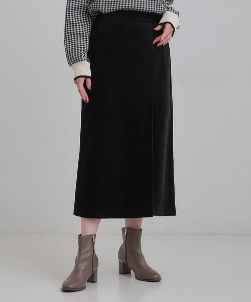 【デザイン】程よく厚みのあるモール風の素材が特徴的なナロースカート。ラップ風のデザインとIラインのすっきりとしたシルエットが大人らしい印象を与えつつ、ナチュラルな風合いで重たくなりすぎないのがポイントです。シンプルなデザインだからこそ、冬のニットやアウターとも相性◎です。【スタイリング】ざっくりニットをアウトしてリラックス感を出したり、タートルニットをインして大人フェミニンコーデに。足元はブーツ合わせで季節感をプラスするのがおすすめ。オンオフ問わず着こなしやすく、1枚あると活躍するアイテムです。【素材】モール風の少し起毛感のある素材を使用しています。※裏地なし【仕様】・ポケットなし・ウエスト後ろゴム・裏地なし※ライトベージュ(051)はやや透け感があるため、インナーの着用をおすすめします。※照明の関係により、実際よりも色味が違って見える場合があります。また、パソコン・スマートフォンなどの環境により、若干製品と画像のカラーが異なる場合もございます。モデル情報:身長163cm B81 W59 H88 着用サイズ:02(M)店舗へのお問い合わせ商品番号:741-74018●製品寸法:01(S):W60~64cm H80cm 総丈79cm02(M):W63~67cm H82cm 総丈80cm03(L):W66~70cm H84cm 総丈81cm04(LL):W70~74cm H86cm 総丈83cm備考: