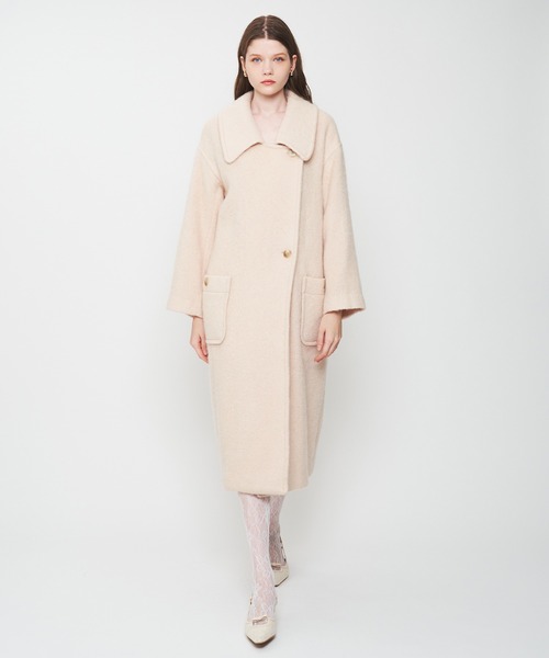 【Design & Fabric】 ゆったりとしたサイズ感のシャギーステンカラーコート。 ステンカラーデザインの衿はフロントボタンを開けた時にはノッチドラペルに見えるパターンで設計し、着方により違った見え方が楽しめるデザインに仕上げました。 贅沢に生地を使用したロング丈で、大人っぽいスタイリングが楽しめます。 バックスタイルのベンツで足捌きも良く、ロング丈でも歩きやすいのも嬉しいポイントです。 日本を代表するウールの産地、尾州で作成したモヘヤループカットシャギー。 ウールモヘヤ素材の表面をブラッシュ加工して起毛させたトレンドのシャギー生地です。 淡いベビーピンクとトレンドのモカはDEICYオリジナルカラー。 透け感:なし 裏地:あり 伸縮性:なし 光沢感:なし Model:H177cm B81cm W58cm H89cm