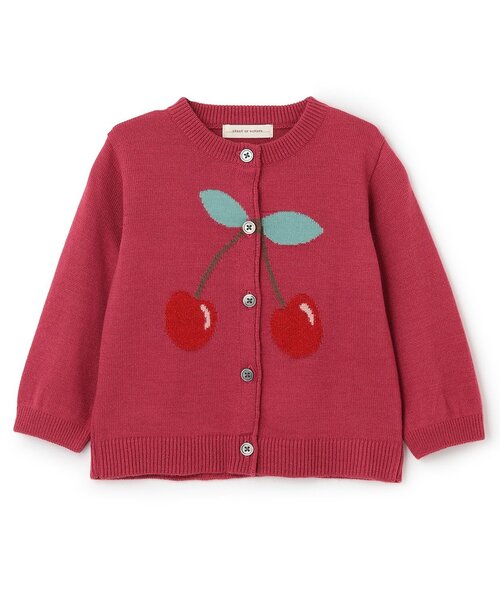 大きなチェリーのグラフィックが目を引くニットカーディガンです。個性的ながら落ち着いたカラーリングで、普段使いに重宝します。光沢感のあるフロントボタンがさりげないアクセント。カジュアルなパンツからフリルスカートまで、さまざまなボトムと好相性です。内側にお名前を記入できるタグつき。【透け感】透けない【生地の厚さ】普通【伸縮性】あり【裏地】なし【ポケット】なし