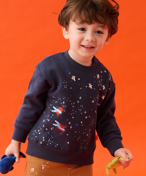 繊細なグラフィックに心惹かれる深海をイメージしたトレーナーです。マフラーをつけたメンダコや、笑顔のクリオネが描かれています。左脇に挟み込んだ立体的なモチーフデザインもポイント。蓄光プリントを採用しており、暗いところでさりげなく光ります。内側にお名前を記入できるタグつき。刺しゅうの裏に「あて布」はございません。【透け感】透けない【生地の厚さ】普通【伸縮性】あり【裏地】なし【ポケット】なし