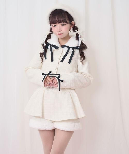 シーズンムードが高まるツイードジャケット♡ファーの襟とブラックのリボンがアクセントになり写真映えもバッチリです♬同素材のショートパンツとセットアップで着用するのがおすすめです◎