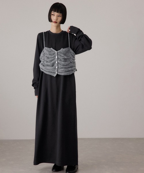 《セットアイテム》ふわりと柔らかなニットキャミソールがこなれ感をプラス。ワンピース単体でも美シルエットで着映える、着回し力が魅力的なセットワンピース◆25AW◆ ADAM ET ROPE' FEMME 【Material】 キャミソール:ふんわりとした柔らかな風合いが特徴的なモヘア混糸を使用。編地に変化を付け表情を出した1着。 ワンピース:フラットな表面感がきれいめな印象の中肉のポンチ素材。シワになりにくく、滑らかなな肌あたりの気持ちの良い風合い。 【Design】 梨地の編地にシャーリングを施し、膨らみ感と表情を持たせたニットキャミソール。 フロントボタン開きとサイドのドロスト仕様で着丈などに変化を付け、好みのバランスで着用が可能。 セットのロングワンピースは、すっきりとしたセミフレアシルエット。 袖丈を長く設定し、くしゅっとした袖口でニュアンスをプラス。 1枚でも、セットのキャミソールとレイヤードしても。 またアームウォーマーやアクセサリーでアクセントをプラスしたりと汎用性の高さが魅力のセットワンピース。 【Color】 ブラック×グレーキャミソール、チャコール×ベージュキャミソール、ブラウン×ブルーキャミソールの3色展開。 【Styling Point】 ニットキャミソールはぎゅっとサイドを絞ると、ロング丈ワンピースやワイドボトムともバランスよく着用が可能。 ジャストフィットのタートルなどとも好相性。 前ボタンの開きで抜け感もプラス。 ワンピースはブーツやミュールなど足元で変化をつけても。 --------------- 透け感:キャミソールあり 裏地:なし 伸縮性:あり 光沢感:なし 生地の厚さ:(キャミソール)薄手(ワンピース)中肉 ポケット:ワンピースあり --------------- ◇モデル情報 身長:169cm size:F(ロングヘア) 身長:165cm size:F(ボブヘア)