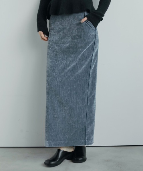 【表地】ポリエステル97% ポリウレタン3% 【裏地】ポリエステル100%上品な光沢感が魅力のベルベット素材を使用したストレートスカート。落ち感のある柔らかな素材で、履き心地の良さも魅力。サイドに同色のパイピングデザインをさりげなく効かせています。カジュアルなアイテムと合わせていただいても、品良くまとまり、幅広いアイテムと合わせやすい一着。オケージョンシーンにもおすすめのシックなブラックと、秋冬にスタイリングを一気に華やかにしてくれるブルーの2色展開です。