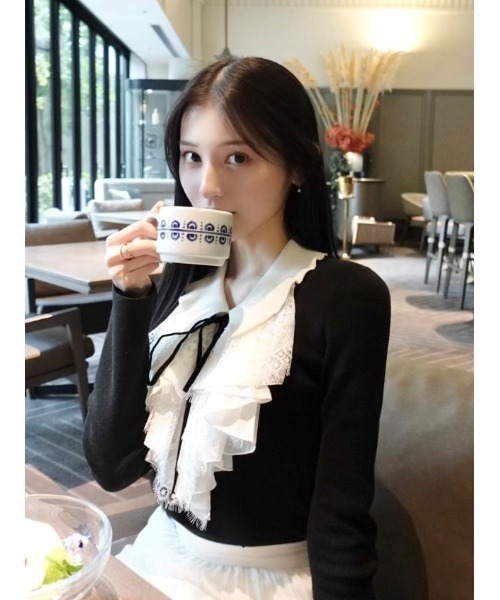 【サステナ素材を使用!クラシカルでモダンなレイヤードラッフルニットプルオーバー】【Design/Styling】昨年も大人気のクラシカルなレイヤードラッフルニットプルオーバーが届きました。しっかりとしたアイボリーのリブ襟付きニットの胸元にたっぷりと軽やかなホワイトスカラップレースやプリーツ入り生地をあしらった華やかなラッフルデザインが印象的。ブラックとブラウンは配色仕上げで顔まわりを明るく演出します。さらに、ベロアのブラック細リボンをプラスして上品に仕上げました。リボンは取り外しが可能です。キレイめニット生地を使用し、フィット感のあるデザインですっきりと仕上げているのでボリューミーなボトムスとも相性抜群です。【Fabric】アイボリー、ブラック、ブラウンの3色展開。ブラックとブラウンの襟はアイボリーの配色仕上げ。サステナ素材を使用しています。透け感;なし裏地;なし伸縮性;あり光沢感;なし生地の厚さ;普通【おすすめ骨格タイプ】■骨格ウェーブ■骨格ナチュラル※照明の関係により、実際よりも色味が違って見える場合があります。またパソコン・スマートフォンなどの環境により、若干製品と画像のカラーが異なる場合もございます。予めご了承ください。商品の色味は、商品単品画像をご参照下さい。 ※商品画像はサンプルのため、色味やサイズ等の仕様に変更がある場合がございますので、予めご了承ください。