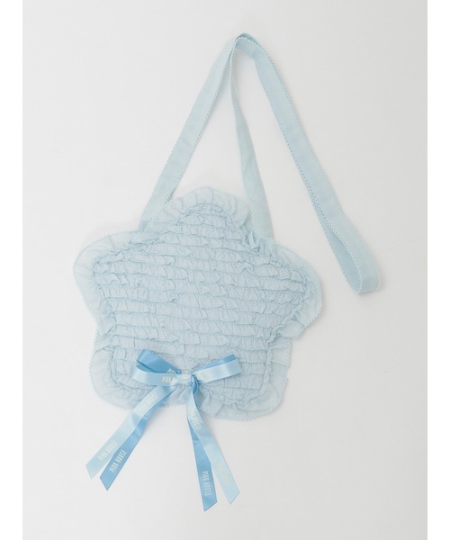 星のかたちが可愛らしい、フリルをいっぱい敷き詰めたキュートなポシェット。さらにピコフリルの縁取りを添えて華やかに。裾まわりにはそれぞれのカラーに合わせた2色のロゴ入りサテンリボンを結んでアクセントに。なかに軽く中わたが入ったふんわりとした仕上がりに。内側にも外側にもポケットが付いていて、外ポケットにはスナップボタンが付いています。入りぐちのところにもスナップボタンが付いていて留められます。「シロ」は、ソライロのピコット刺繍の縁取りを添えてアクセントにしています。