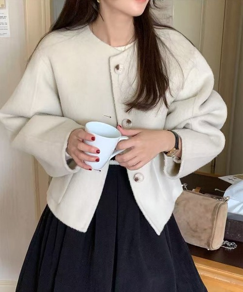 オンオフ問わず使える万能アウター!ノーカラーショート丈コート【デザイン】シンプルながらも上品な印象を与えるノーカラーショートコート。程よくゆとりのあるシルエットで、インナーを選ばずに羽織りやすい一枚です。ショート丈が脚長効果を引き立て、バランスよくスタイルアップを叶えます。フロントの大きめボタンがさりげないアクセントに。【素材感】着心地の軽いポリエステル素材伸縮性:なし/ 透け感:なし / 裏地:あり 手洗いによる洗濯可 / ドライ・ウェットクリーニング可【コーディネート】ハイウエストのフレアスカートやワイドパンツと合わせて韓国っぽいスタイリングに仕上げるのがおすすめです♪インナーにはリブニットやブラウスを合わせると、清楚で大人かわいいムードにまとまります。ショート丈を活かしてロングブーツと合わせても◎【※お取り扱い上のご注意】1:モニター環境等により実際の商品と多少色味が異なって表示される場合がございます。予めご了承下さい。2:屋外で撮影された商品は、天候により多少実際のカラーと異なる場合があります。商品のカラーはトルソー(マネキン)の商品画像をご参照ください。3:濃い色の商品は、お洗濯や摩擦等による移染にご注意ください。4:末永くご愛用頂く為に、アテンションタグ・洗濯ネームを必ずご確認の上、着用又はお取り扱い下さい。5:生産時期により、色、サイズ、デザイン、素材の質感が多少が異なる場合がございます。あらかじめ御了承下さいませ。