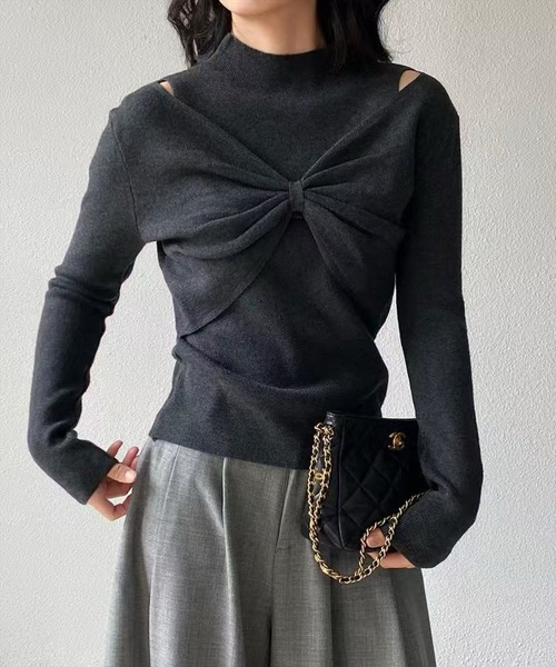 立体リボンが映える大人フェミニンニット!フロントリボンハイネックニットトップス 【デザイン】 胸元のフロントリボンデザインが印象的なハイネックニットトップスです。 立体感のあるリボンモチーフが上品に映え、フェミニンさと大人っぽさを兼ね備えた1枚。 ボディラインにほどよくフィットするシルエットで、女性らしいメリハリを引き立てます。 【素材感】 伸縮性のあるレーヨン素材 伸縮性:あり/ 透け感:なし / 裏地:なし 手洗いによる洗濯可 / ドライ・ウェットクリーニング可 【コーディネート】 ハイウエストのスラックスやタイトスカートを合わせると、韓国っぽいきれいめカジュアルに仕上がります。 ショート丈のアウターを羽織ってリボンを見せるスタイリングもおすすめ。 ロングブーツやミニバッグをプラスしてトレンド感をアップ。 【※お取り扱い上のご注意】 1:モニター環境等により実際の商品と多少色味が異なって表示される場合がございます。予めご了承下さい。 2:屋外で撮影された商品は、天候により多少実際のカラーと異なる場合があります。商品のカラーはトルソー(マネキン)の商品画像をご参照ください。 3:濃い色の商品は、お洗濯や摩擦等による移染にご注意ください。 4:末永くご愛用頂く為に、アテンションタグ・洗濯ネームを必ずご確認の上、着用又はお取り扱い下さい。 5:生産時期により、色、サイズ、デザイン、素材の質感が多少が異なる場合がございます。あらかじめ御了承下さいませ。