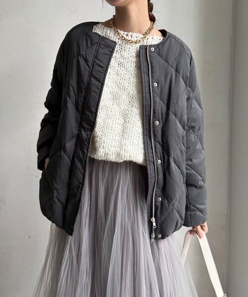■2025 AUTUMN & WINTER ITEM■コーディネートへの取り入れやすさ抜群のダウンマットな風合いがモダンな雰囲気のキルティングダウン。ダウン+フェザーの中綿で、真冬までとっても暖かく着られる1着です。軽量で保温性にも優れた中綿素材で仕上げた大きめのダイヤ柄キルティングが、ポイントとなってくれます。ハイネックニットを着た時やマフラーを巻くときなどに、首元がゴワつかずすっきりと着られるのが嬉しいノーカラーデザインもうれしいポイント。また、袖口には風の侵入を防ぎ暖かさを保つための内側に隠れるリブを採用。- POINT -・マットな素材感で季節感漂うデザイン・軽くて暖かい中綿素材・今年らしいミドル丈--------------------------------洗濯方法:水洗い不可能透け感: なし裏地: あり伸縮性: なし--------------------------------【 ♡ をクリックでお得な情報をお知らせいたします 】〈 商品のお気に入り登録 〉 お気に入りアイテムのお値下げ・再入荷・在庫ラスト1点など通知を受けることができます。〈 ブランドのお気に入り登録 〉DOUDOUの新商品や再入荷、セール、クーポン配布などお得な情報を受けることができます。--------------------------------------※ 掲載画像の商品の色味は、 撮影場所や光の当たり具合などにより色味が異なって見える場合がございます。 また、お客様のお使いのPC・スマートフォン等のモニター環境などにより色味が異なって見える場合がございます。予めご了承の上ご注文ください。 ※着用、お取り扱いの際は、商品についている品質表示とアテンションタグを必ずご確認下さい。
