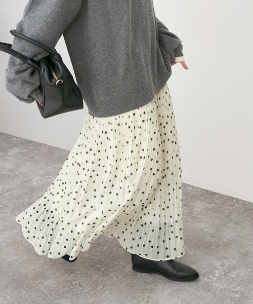 ※完売のブラックベースは、新品番≪26060200903010≫にて追加予約スタート(12/9(火)正午~)歩くたびに揺れる、大人のドットプリーツイージースカート。上品な梨地ジョーゼットにドット柄をプリントし、繊細なランダムプリーツをかけた一枚。裾にかけてプリーツをゆるめ、歩くたびに軽やかに揺れるシルエットが魅力です。ウエストはゴム仕様で穿き心地の良さを叶えつつ、ベルト上にあしらった小さなプリーツフリルがさりげないポイントに。フェミニンさと上品さを兼ね備えたデザインは、ボリュームのあるニットやコートとのスタイリングにも好相性。冬の装いに軽やかな抜け感をプラスしてくれます。**********************透け感:なし(裏地のない足首部分のみ透け感あり)裏地:あり伸縮性:なし光沢感:なし生地の厚さ:普通**********************【スタッフ着用コメント】《スタッフS》20代後半/身長:158cm/普通/普段サイズ:S/着用サイズ:38サイズ感:ウエストゴムで38サイズでも大きく感じず、着丈も丁度いいです。素材感:透け感のあるプリーツ素材なので、重たく見えず着心地も軽やかです。着心地:プリーツが細やかで落ち感があり、ふんわりしすぎず大人っぽく穿けます。**********************※取り扱いについては、商品についている品質表示でご確認ください。※こちらの商品は、一部店舗(EXPOCITY店+TOKYO-BAY店)とオンライン限定での取り扱いになります。直接店舗へお問い合わせの際は、取り扱い店舗へお願いいたします。なお、入荷店舗は予告なく変更になる場合がございます。※照明の関係により、実際よりも色味が違って見える場合があります。またパソコン・スマートフォンなどの環境により、若干製品と画像のカラーが異なる場合もございます。※商品の色味は、商品アップ画像をご参照ください。ブラックベース着用スタッフ:161cm 着用サイズ:38ホワイトベース着用スタッフ:161cm 着用サイズ:36ブラックベース詳細着用スタッフ:163cm 着用サイズ:38ホワイトベース詳細着用スタッフ:163cm 着用サイズ:36本体:手洗い可能