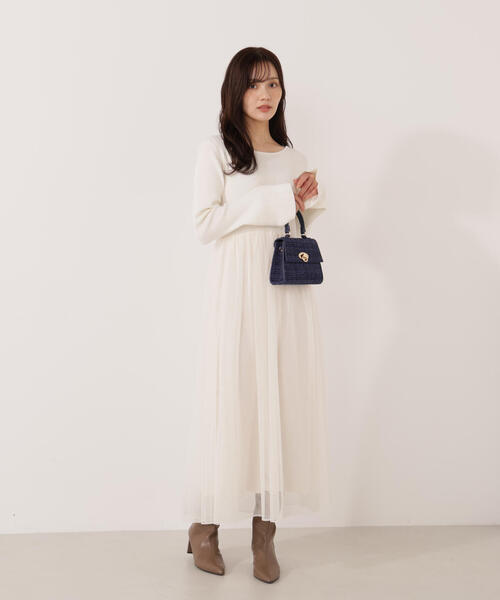 チュールスカートをドッキングした異素材コンビのニットワンピース。デコルテラインが美しく見えるデザインです。柔らかなニット素材と軽やかなチュールの組み合わせが華やかさを引き立て、特別なシーンにもぴったり。動きやすさもあり、デイリー使いにもお勧めです。きらふわカーディガン(店舗商品番号121-5277102)合わせもイチオシです。<素材>もっちりとした糸を使用しています。<詳細>仕様・開閉なし裏地・なし透け感・なし / 光沢・なし / 伸縮性・あり生地の厚さ・普通※モデルの着用画像の場合、光の当たり具合により、実際の色味と異なって見えることがございます。色味は、商品単体の画像をご参照ください。<商品のお気に入り登録>お気に入りアイテムの値下げ・再入荷・在庫1点などの通知を受け取ることができる便利機能ですので気に入ったアイテムはお気に入り登録がおすすめ!<ショップのお気に入り登録>新商品や再入荷、セール、クーポン配布などお得な情報を受け取ることができます。●撮影はサンプル商品で行っている為、仕様とサイズが異なる場合がございます。●スタジオ及び屋外で撮影した着用画像は、光の当たり具合で色味が違って見える場合があります。予めご了承ください。