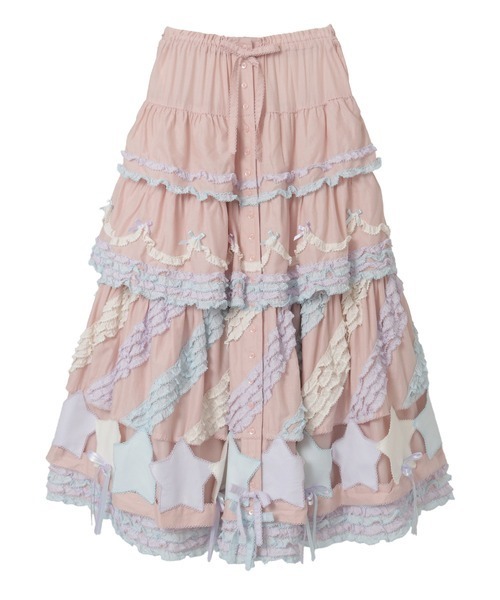 星のかたちをしたキュートなワッペンを裾まわりに連ねたローンフリルの段々ロングスカート。 ワッペンはそれぞれのカラーに合わせた配色使いがお楽しみいただけます。星のワッペンたちのまわりにはさらに配色フリルをあしらって。斜めのラインがまるで流れ星のよう。 さらにそれぞれの段々フリルにも配色フリルをあしらった豪華で華やかなフリルスカートに。 カラーによって雰囲気が異なるので、どのカラーにしようか迷うところも楽しい1枚に。