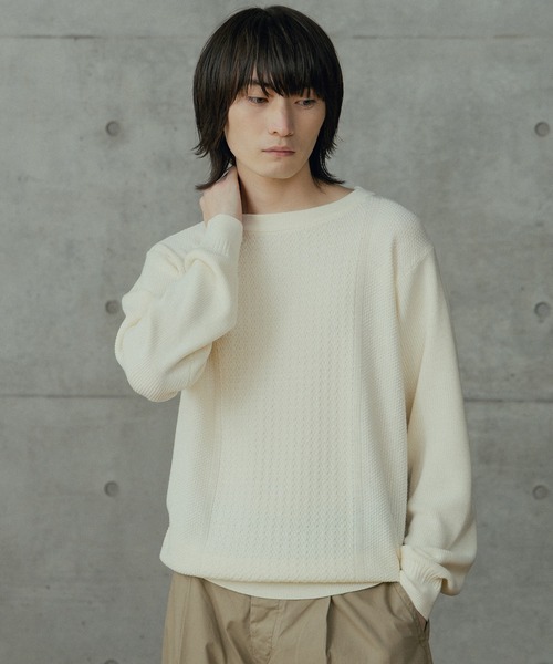 【立体的な編み地が魅力のウール混クルーネックニット】細かく編まれたハイゲージの編み地が特徴のセーターです。立体的な編み柄(組織柄)が施されており、シンプルながらも表情豊かな仕上がりとなっています。《上品で着回し力の高いデザイン》首周りはベーシックなクルーネックで、鎖骨のラインに沿ったすっきりとした印象です。肩の切り替えは、身頃の編み柄とは異なる編み地で表現されています。袖口と裾は、リブ編みで全体のシルエットを引き締め、程よいフィット感を生み出しています。《万能なカラーバリエーション》オフホワイト、落ち着いたブラウン、ブラックの3色、合わせるボトムスやインナーを選ばず、着回し力の高いアイテムです。細かく均一な編み目が上品な印象を与え、一枚での着用はもちろん、アウターのインナーとしても活躍します。【Rattle Trap/ラトルトラップ】 時代と共に変化し続けるライフスタイルにおいてリアルに共存することができるタウンウェア。 『ワーク』『ミリタリー』『デニム』をベースに素材とディティールにこだわりを持ちながら今を表現。【画像に関するご注意】 ※画像はサンプルです。仕様が変更になることがありますのであらかじめご了承ください。 ※商品の色味につきまして、お客様のお使いのPCのモニター環境、設定により実際のカラーと画像の色味が違って見える場合が御座います。予めご了承の上、ご注文下さい。 ※屋外での撮影画像は光の加減で、実際の商品より明るく見える場合が御座います。商品の色味は生地アップ・スタジオ撮影の画像をご参考下さい。