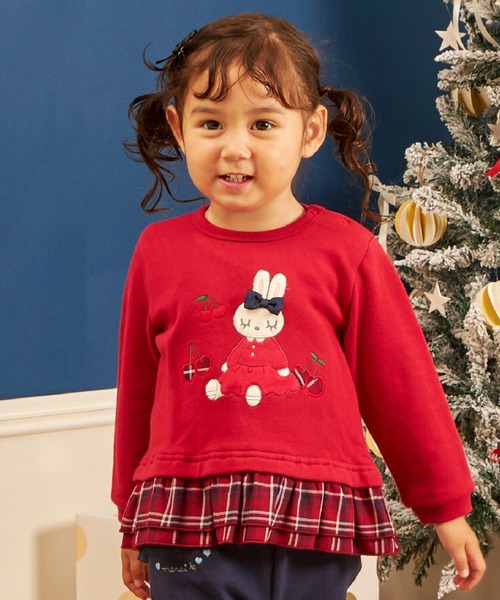 リボンを付けたmimiちゃんのアップリケと、裾にはチェックの段フリルをあしらったトレーナーです。カジュアルでありながら、フリルとアップリケに使われたタータンチェックが、トラッドテイストで、上品な印象を与えてくれます。80、90・は、着脱がしやすい左肩開きの仕様。