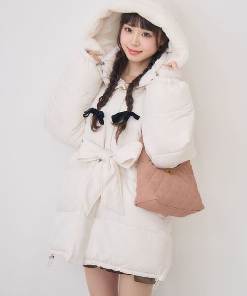 <毎年大人気のファーアウターが今年もリバイバル♪>▼デザイン昨年大人気を頂いたFファー付中綿コートをブラッシュアップしてリバイバル販売決定!中綿で厚手のアウターは真冬に大活躍!ウエストマークのリボンがガーリーなアクセントになるとともにメリハリあるシルエットに仕上げてくれるので、スタイルアップして見えます。フードを被れば周りのファーが女の子らしさを演出してくれます。▼コーディネートとっても可愛くて、ガーリーなアイテムなので、ボトムはミニ丈にし、ロングブーツ合わせがおすすめ!ハイネックでマフラーいらすなので、スタイリングを綺麗に守ってくれます。------------------------------生地感:厚手伸縮性:なし透け感:なし裏地:あり------------------------------▼ブランド紹介ems excite (エムズエキサイト)“more fun more cute”今をもっと楽しくもっと可愛くいたい女の子に向けたgirly cuteなブランド#コート #アウター #ファー #中綿アウター #ガーリーコーデ #フード ▼注意事項※撮影環境やモニター環境によって実際の商品とお色味が多少異なってみえる場合がございます。品番:EW556921B002 / 品名:Fファーフード付中綿コート