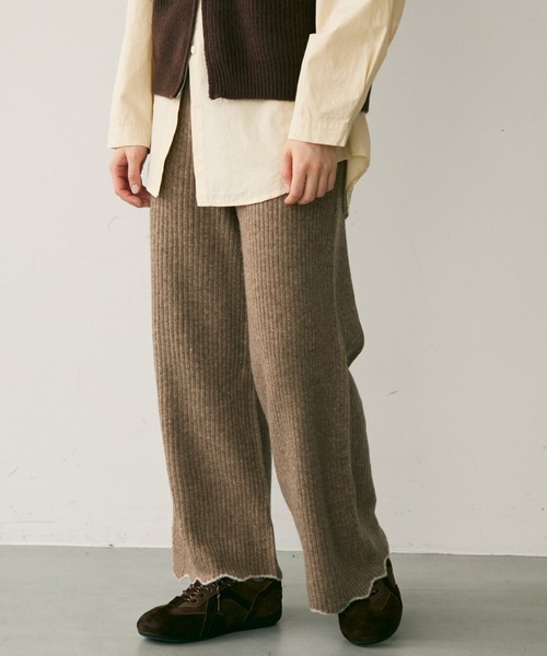 【バイカラーのウェーブヘムがアクセントのニットパンツ】・裾に向かって少しフレアの入ったシルエットで脚のラインを綺麗に見せてくれるパンツ・もちふわな手触りが心地良く、ちくちくしないストレスフリーな素材感・リブ編みで伸縮性も良く、細見え効果も○・バイカラーでアクセントを付けたヘムデザインもさりげないポイントに~スタイリング~シャツやカーディガン、スウェットと合わせて大人っぽくこなれた印象に。足元にはスニーカーやブーツ、パンプス等も好相性◎ワンピースとのレイヤードにもおすすめです。- - - - - - - - - - - - - - - - - - - - - - - - - - - - - - - - -透け感:なし厚さ:普通裏地:なし伸縮性:あり光沢感:なしポケット:なし洗濯: ドライクリーニング推奨- - - - - - - - - - - - - - - - - - - - - - - - - - - - - - - - -※着用、お取り扱いの際は、商品についている品質表示とアテンションタグを必ずご確認下さい。秋冬服/ニットパンツ/淡色/ナチュラル