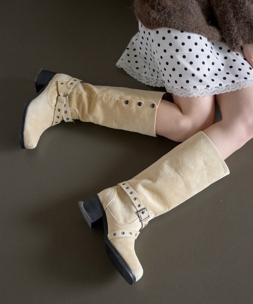 【サイドボタンを閉めてロングに、開けて折り返して履ける2way仕様】5cmヒールスクエアトゥクロスベルトユニークブーツ