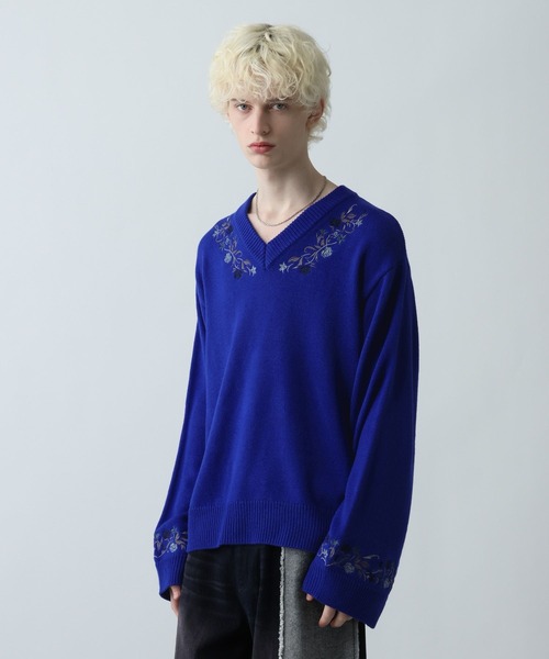 ーーー繊細で華やかな花柄の刺繍を施した、個性を際立たせるVネックニット。ーーーDESIGNネックライン、袖口、後ろの襟元に花柄の刺繍が贅沢に施されおり、一枚着はもちろんアウターの中に着てもアクセントとなるデザイン。刺繍糸はモノトーンと寒色系のカラーを中心に構成し、クールでモードな雰囲気に仕上げています。袖幅にゆとりを持たせたワイドスリーブを採用。袖にボリューム感と動きが生まれ、トレンド感のある印象に。オーバーサイズシルエットでリラックス感のある着こなしが可能です。インナーにハイネックや襟付きシャツを重ね着すると、今年らしいレイヤードスタイルが叶います。MATERIAL柔らかな肌触りでチクチク感が少なく、軽量でありながら保温性にも優れています。刺繍にはレーヨンを使用しており、上品で艶やかな光沢が刺繍の立体感を引き立てます。