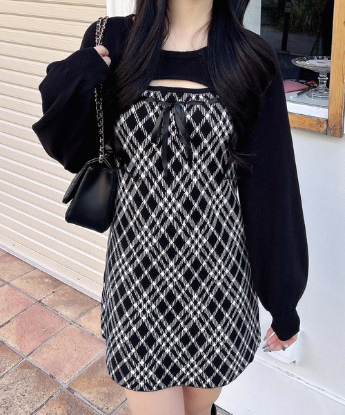【デコルテ部分の肌見せがかわいい♡チェック柄ニットワンピース】 ▼Design デコルテ部分の肌見せが大人かわいい印象のニットワンピースです。 切り替えデザインになっているのでこれ一枚で手軽にトレンドのスタイルが完成します。 胸元には光沢のあるリボンを編み込んでキュートに仕上げています。 ほどよいフィット感で身体のラインが綺麗に出るのでスタイルアップ効果も抜群◎ 冬の大人かわいいコーデはこのワンピで決まりっ! ▼Styling ミニ丈なのでロングブーツ合わせがおすすめです。 小物はベレー帽やバニティーバッグを合わせるとトレンド感のある 大人かわいいスタイリングに仕上がります♪ ・ニット製品のため生地に伸縮性があり、サイズに若干の誤差が生じる場合がございます。予めご了承くださいませ。 【以下モカピンクオフ/チェック参考。カラーにより多少の誤差あり】 ・透け感:透けない ・伸縮性:あり ・生地の厚さ:普通 ・裏地:なし ▼Recommend ・ニットワンピース ・ミニ丈 ・ワンホンコーデ ・ニット ・切り替えデザイン ・スタイルアップ