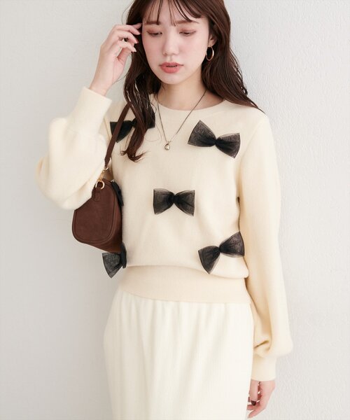 【2025AW natural couture】 ランダムリボンニットプルオーバー ■Design 特徴的なリボンは、程よい透け感のある別布のポリエステル素材を使用。 ニット本体との素材感のコントラストが、奥行きのある表情を生み出します。 リボンのさりげない透け感が、軽やかさと抜け感をプラスし、大人の女性にも似合う甘さ控えめなデザイン。 袖はふんわりとしたボリュームスリーブで、女性らしい柔らかなシルエットを演出。 首元はベーシックなクルーネックなので、様々なアクセサリーと相性が良く、自分らしいアレンジを楽しめます。 ■Styling カジュアルなデニムはもちろん、きれいめなスカートやパンツとも好相性。 普段使いから、ちょっとしたお出かけまで、幅広いシーンで活躍します。 デニムと合わせてカジュアルダウンすれば、こなれ感のある大人カジュアルスタイルに。 フレアスカートと合わせてフェミニンに着こなせば、デートにもぴったりの愛らしい印象になります。 シンプルなボトムスに合わせるだけで、コーディネートの主役になる存在感。 ■Fabric しなやかで肌触りがよく、快適な着心地。 ================== お手入れ方法:手洗い 透け感:なし 裏地:なし 伸縮性:あり 光沢感:なし 生地感:滑らかな生地感 ================== ※着用、お取り扱いの際は、商品に付いている品質表示とアテンションタグを必ずご確認ください。 【お気に入り登録でお得な情報がいっぱい】 ・「商品のお気に入り登録」で再入荷通知や、ラスト1点の通知、セール通知をいち早く受け取ることができます。 ・「ブランドのお気に入り登録」で新商品や再入荷など、お得な情報を受け取ることができます! ※店舗の入荷時期は商品によって異なります。 店頭の在庫状況につきましては各店舗にてお問い合わせください。 ※撮影時の光の関係で、画面上の画像と実際のお色とでは若干の色差が生じる可能性がございます。 また、ご覧いただいているモニター画面や、お使いのブラウザによっても、お色の違いがございますことをあらかじめご了承くださいませ。 20251114 2025AW_natu 25AW