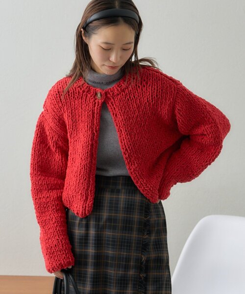 手編みのざっくり感が可愛い!羽織るだけで旬バランスが完成するコンパクトニット◎■デザインざっくりとした太めの糸で編み立てた、存在感たっぷりのニットボレロ。コンパクトな丈感がスタイルアップを叶えつつ、さっと羽織るだけでコーデをまとめてくれます◎首後ろのGEVACOネームパーツと左サイドのブランドタグが、さりげなくアクセントに。Tシャツやニット、コンパクトめなタートルネックなどシンプルなトップスも一気にお洒落見せ!ノースリーブやワンピースの上から重ねてもバランスが取りやすく、季節の変わり目にも重宝します。シンプルアイボリーと、差し色にキャッチーなパープル・レッドの3色展開です。■スタイリングハイウエストボトムと合わせてコンパクトにまとめるとバランス◎ロゴTやボーダートップスに羽織って、カジュアルダウンもハマります。きちんと感を出したい日にはリブニットやタートルネックがおすすめ。トレンドのワイドパンツやナロースカートと相性のいい丈感です!【GEVACO/ゲバコ】1960年代にベルギーにて創業した老舗ワークウエアメーカー。馬がオーバーオールを着た可愛いブランドアイコンと、馬に引っ張られても破けないワークウェアを製造するメーカーとして有名になりました。創業当初はその丈夫さを買われ、ベルギー軍用の軍服として採用された実績があります。本国では1990年代にブランドは消滅しました。2021年、当時のブランドとの繋がりはありませんが、日本にて過去のデザイン・ディティールを参照し、現代風にアレンジした新たな“GEVACO"としてスタートしました。(商願2020-44488)公式インスタグラムはこちら:@gevaco_official■お手入れ方法洗濯:液温は40 ℃を限度とし、手洗いができるアイロン:不可タンブル乾燥:不可・・・・・・・・・・・・・・・・・・・・・・透け感:なし裏地:なし伸縮性:なし光沢感:なし生地の厚さ:やや厚手・・・・・・・・・・・・・・・・・・・・・・▼気になる商品をお気に入り登録ハートをクリックして《お気に入り登録》がオススメです!入荷情報や、クーポン情報が通知されるようになります。※画像の商品はサンプルを使用しております。実際の商品と若干の仕様が変更になる場合がございますので、予めご了承の上ご注文くださいますようお願いいたします※屋外の光や照明の当たり具合で、実際の商品の色味とカラー別画像の色味に若干の違いが発生する場合がございます。詳細画像と併せてご確認の上、ご注文いただきますようお願い致します。※独自のタイムセールなどの施策により、実店舗と価格差が発生する場合がございます。※実際の店舗在庫につきましては、各店舗に直接お問い合わせください。