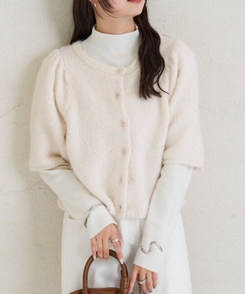 チョーカー×ふわふわな生地感◎春先まで着られるトレンド感たっぷりな半袖ニットカーディガン●デザイン・柔らかくふんわりとした素材感と程よいパフスリーブが、女性らしいニットカーディガン。・やや短めの丈感ですっきりしたシルエットで、スタイルアップ効果も期待できます。・フロントのボタンがアクセントになり、可愛らしさをプラス。袖口の程よいボリューム感が、華奢見えを叶えます。・付属のチョーカーは取り外し可能で、気分やコーデに合わせてアレンジも自由自在です。●スタイリング・Tシャツやカットソー、タートルネックやハイネックのニットに重ねるだけで、こなれた印象に。・ワンピースやロングスカートに合わせてニュアンス感たっぷりな韓国スタイルに。・ハイウエストのボトムスと合わせれば、トレンド感のある着こなしが完成します。●おすすめスタイリングアイテム・レースドッキングロンT・【インフルエンサーイチ押し!】【4色展開 / さらっとした手触り】タートルニット・2wayシアーロンT・【2サイズ展開 / オールシーズン着られる】バルーンロングスカート・【全骨格スタイルアップが叶う♡ウエスト調整可能!】レース切替デニム・【新色NAVYが登場/ストライプ柄、無地 / ウエストの配色がポイント】Wベルトパンツ・【美脚、脚長効果が叶う♡】ビューティーフレアデニム●スタッフ着用コメント・身長158㎝ 骨格ストレート短丈なのでスタイルアップ効果があります。柔らかい素材で着心地も良く、お気に入りです!・身長162㎝ 骨格ナチュラル袖のボリューム感が可愛いです。カジュアルにもきれいめにも合わせやすいので、重宝します。合わせるアイテムによって、春先まで着られるのでおすすめです!●素材-----------------------------------------------------洗濯:40度限度 手洗い/石油系ドライクリーニング可アイロン:低温120℃まで スチームなし(あて布使用)タンブル乾燥:不可裏地:なし伸縮性:あり光沢感:なし生地の厚さ:普通------------------------------------------------------商品のお気に入り登録➡ お気に入りアイテムの値下げ・再入荷・在庫1点などの通知を受け取ることができます。ブランドのお気に入り登録➡ 新商品や再入荷、セール、クーポン配布などお得な情報を受け取ることができます。※サイト上のカラー名と、お届け商品に記載されているカラー名が異なる場合がございます。※商品の色味は、撮影場所や光のあたり具合などにより色味が違って見える場合が御座います 。 また、お客様のお使いのPCのモニター環境などにより色味が違って見える場合が御座います。予めご了承の上ご注文下さい。※ご注文いただいた予約商品のお届け時期の確認は、注文履歴ページより行えます。------------------------------------------------------
