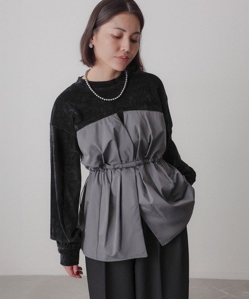 【Floran ビスチェドッキングペプラムベロアトップス】 \質感のコントラストが魅せる/ 立体美シルエットのドッキングトップス ■Styling トレンドの異素材ドッキングデザインをFloranらしくモードに仕上げたトップスが登場しました。 身頃に柔らかなベロア、胸から下はハリ感のある布帛素材を組み合わせ、立体的なシルエットと異素材のコントラストを楽しめます。 ウエストのドローストリングを絞れば自然なくびれと女性らしいペプラムラインに変化。 ラフに着れば抜け感のあるリラックススタイルにも◎ シルエットの強弱が付くためどんな体型にも美しくフィットします。 ボトムはワイドパンツでハンサムに ロングスカート合わせでフェミニンモードにと、シーンや気分に合わせて印象を変えられる万能トップスです。 1枚でレイヤードスタイルのような奥行きを演出し、着るだけでスタイルアップが叶う立体シルエット◎ Floranらしい素材で魅せるデザインを存分に楽しめるアイテムは 上品さと遊び心を兼ね備えた今季の主役トップスです。 着用シーン ✓1枚でサマになる主役トップスとして ✓休日のお出かけや女子会、ディナーシーンに ✓オフィスカジュアルにも馴染む上品デザイン ✓シーズンレスに活躍(秋冬~春先までOK) ■Detail 身頃部分はソフトなストレッチベロア素材で程よい光沢感◎ 胸から下はハリのある布帛素材を使用しシルエットをキープしてくれます。 ウエストはドローストリング仕様で絞り具合を自由に調節可能。 ペプラムのようなフレアラインで女性らしさと体型カバーを両立。 袖口はボリュームスリーブで抜け感とバランスをプラスし、バックスタイルまで立体的なフォルムでどこから見ても美しいシルエット。 ■Material なめらかなベロア生地は、肌あたりが良く上品な微光沢。 別地にはハリ感のある布帛素材を使用しフォルムを美しくキープしてくれます。 異素材の組み合わせにより着るだけで奥行きのあるスタイルに◎ ストレッチ性があり見た目以上に軽く快適な着心地です。 ▽生地感 透け感:あり 〇〇〇〇●なし 生地の厚さ:厚い 〇●〇〇〇 薄い 裏地:なし 伸縮性:あり ※この素材は摩擦(特に湿った状態での摩擦)や、汗や雨などでぬれた時は他の衣料や下着・バッグなどに色が移る場合がありますので、ご注意下さい。 ※繊細な素材を使用している為、引っ掛かりには十分お気をつけください。 ※洗濯の際は、他の物と一緒に洗わないでください。 ※濡れた状態で他の洗濯物を重ね合わさないでください。 ※漂白剤および漂白剤入りの洗剤のご使用はお避け下さい。 ※水洗いやクリーニングの際は、クリーニングネットを使用ください。また、つけおき洗いはお避けください。 ※商品の梱包には細心の注意を払っていますが、通販の特性上、到着時に畳みシワがついている可能性がございます。予めご了承ください。 ※詳しいお手入れ方法は商品タグをご参照ください。 ※この商品は、糸及び編組織の性質上、引っかけ・引っかかりやすい性質をもっております。着脱時には十分ご注意下さい。 【Information】 ◆《お気に入り登録》がオススメ◆ ・「商品のお気に入り登録」で再入荷通知や、ラストの通知、セール通知も受け取ることが出来ます。 ・「ブランドのお気に入り登録」で新商品や再入荷など、お得な情報を受け取ることが出来ます ※撮影時のライティング、太陽光、ご覧になっているモニター・PC環境により、実際の商品と色味が異なって見える場合がございます。予めご了承をお願い致します。