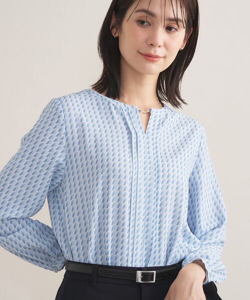 【デザインポイント】 繊細な印象に仕上げたオリジナルのジオメトリック柄が華やかさを演出するブラウスです。 スーツのインナーとしても合わせていただけるサイジングになります。 前のタックデザインは、ジャケットを羽織っても華やかさを保つポイントです。 スリットネックにすることで女性らしい抜け感も出る一枚です。 【スタイリングポイント】 スーツスタイルのインナーとして合わせていただくのがおすすめです。 【素材ポイント】 シルクのような光沢と清涼感のある風合いが特徴のジョーゼットに、バイアスデザインの幾何モチーフをプリントした素材になります。 透けにくい程よい肉感があり、マシンウォッシャブル・UVケア性を併せ持った素材になっております。 ※この製品は、太陽光線中の紫外線(UV)を通しにくくします。この効果は永久的ではありません。 ※照明の関係により、実際よりも色味が違って見える場合があります。また、パソコン・スマートフォンなどの環境により、若干製品と画像のカラーが異なる場合もございます。 モデル情報:身長170cm B74 W60 H86 着用サイズ:38(M) 店舗へのお問い合わせ商品番号:127-85001 ●製品寸法: 05(XXS):着丈53cm B93cm 袖丈52cm 肩幅36cm 13(LL):着丈58cm B116cm 袖丈55cm 肩幅42cm 15(3L):着丈58cm B120cm 袖丈55cm 肩幅43cm 19(5L):着丈60cm B128cm 袖丈54cm 肩幅44cm 36(S):着丈55cm B101cm 袖丈54cm 肩幅37cm 38(M):着丈56cm B104cm 袖丈55cm 肩幅38cm 40(L):着丈57cm B107cm 袖丈56cm 肩幅39cm 備考: