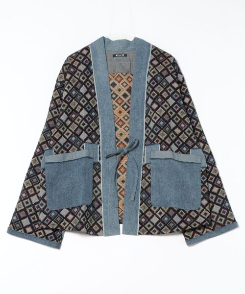 幾何学模様のジャカード生地をメインにデニムをプラスした、遊び心たっぷりなデザインのメンズカーディガン。デニムはウォッシュ加工や端のカットオフを施し、ヴィンテージ感を演出。フロントのポケットや袖の肘当て(エルボーパッチ)もポイント。ジャカード生地の柄は、トルコなど中近東に暮らす遊牧民の伝統織物『キリム』からインスパイアされた柄。邪視から身を守るとされるイーヴィルアイ(魔除け)をモチーフにしています。ゆったりとしたオーバーサイズでリラックス感のある着心地。異素材の組み合わせが個性的で、華やかなフォークロアスタイルに◇◆男女兼用、ユニセックスでご着用いただけます。※こちらの商品は1点1点職人による手作りとなります。その為、生地の取り方により柄の出方や形・色合いなど若干異なる場合がございます。あらかじめご了承ください。※屋外での撮影画像は、光の当たり具合で色味・カラーが違って見える場合がございます。商品のカラーは、スタジオ撮影の画像をご参照ください。Amina Collection Co.,LTD.