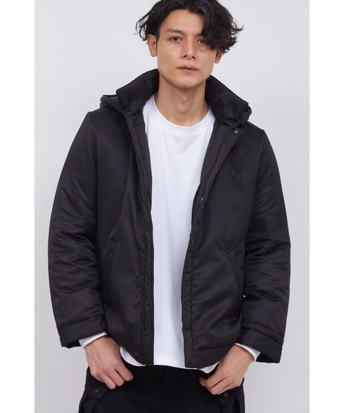[DESIGN]【オンオフ自在!洗練された大人の高機能ブルゾン】羽織るだけでサマになる、スタイリッシュな中綿入りブルゾンが登場。高密度ポリエステルのツイル生地を採用し、上品な光沢感とハリが洗練された印象を与えます。ステンカラーデザインとシャープなカッティングが特徴で、ビジネスシーンから休日のカジュアルスタイルまで、幅広いコーディネートに対応。中綿入りで暖かく、これからの季節に大活躍間違いなし。さらに、フードは取り外し可能なので、その日の気分やスタイルに合わせて着こなしを楽しめます。[TEXTILE]繊維を高密度に織り上げたポリエステルツイル生地です。上質な手触りと、繊細な光沢感が魅力的な素材感です。