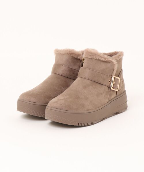 履き口にたっぷりとあしらわれたフェイクファーが、見た目にも暖かいショートブーツ。ベルト部分に配されたバックルが、カジュアルなブーツにエレガントな華やかさをプラス。スタイリッシュなプラットフォームソールが、スタイルアップ効果と同時に地面からの冷えを防ぎます。サイドジップ付きで着脱もスムーズにできる一足。