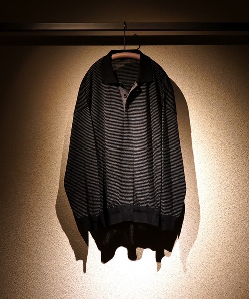 TROVE 25AW "Future vintage” 日本人が持つ、緻密で高品質なモノづくりの考え方を現代に当てはめ、 "Future vintage"となる服、"貴重な収集品=TROVE"となることを目的に作られた服。 生地は、原料や混率に捉われず、その素材の特性が活かされたものを採用。 混紡素材や合繊素材も現代の進化ととらえ、アイテムとの調和を考えて使用。 縫製糸に関して、安価な”スパン糸"ではなく、耐久性に優れたポリエステル糸の芯に綿糸を巻き付けた”コア糸”を使用。 日本的モノづくりの発想から生まれた”コア糸"を使用することで、 強度性を保ちつつ、綿糸の持つ色彩と経年変化を感じられる服を提案します。 オーストラリア産のメリノウールで編み上げたハイゲージニットポロ。 原料由来の軽さと滑らかさでノンストレスな着心地。 リブは編み地を変えることで表情を持たせた。 ロゴ入りのオリジナルボタン仕様。 ブランド品番:74KNT02