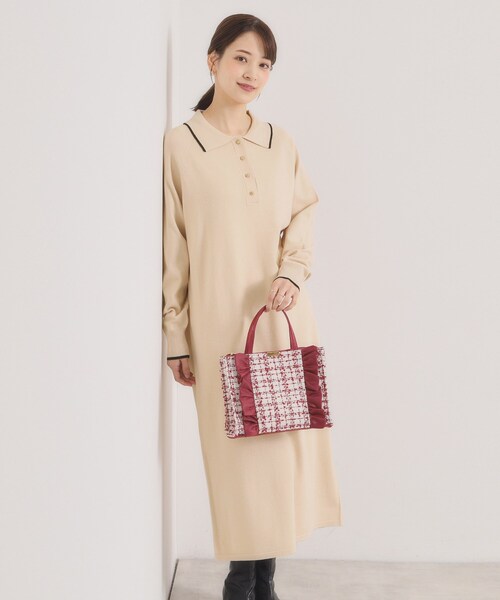 【デザイン】トレンドのポロ衿デザイン。ゆるっと着られるリラックス感あるシルエット。一枚で簡単にトレンド顔になれるポロ衿デザインのニットワンピ。衿端と袖口端には配色ラインでアクセントをオン。ほんのりレトロ感あるゴールドボタンもポイント。身体のラインを拾いにくいゆったりシルエットでリラックス感のある着心地。【素材】ポリエステル・レーヨンの柔らかく滑らかな着心地の糸を使用したハイゲージニット。【仕様】・ポケットなし・裏地なし※ライトベージュ(051)はやや透け感があるため、インナーの着用をおすすめします。※照明の関係により、実際よりも色味が違って見える場合があります。また、パソコン・スマートフォンなどの環境により、若干製品と画像のカラーが異なる場合もございます。----------------------------------------★お気に入り登録がおすすめ★▽気になる商品はハートマークをクリック!・再入荷やセールの通知をお知らせ・お気に入り一覧からいつでもチェック▽ブランドのお気に入り登録も!・新商品やお得な情報をいち早くお知らせ----------------------------------------モデル情報:身長163cm B78 W57 H84 着用サイズ:00(フリーサイズ)店舗へのお問い合わせ商品番号:P93-54007●製品寸法:00(フリーサイズ):着丈114cm B104cm 裄丈80cm W102cm H102cm備考: