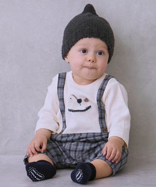 車と木馬のかぎ針編みモチーフがキュートなカバーオールです。 スナップボタン仕様なので簡単にお着替えできます。 サスペンダーをつけているようなデザインは、一枚着るだけでコーデが完成。 日常着にもお出かけにも大活躍間違いなしです。 内側にお名前を記入できるタグつき。 【透け感】透けない 【生地の厚さ】普通 【伸縮性】あり 【裏地】なし 【ポケット】なし