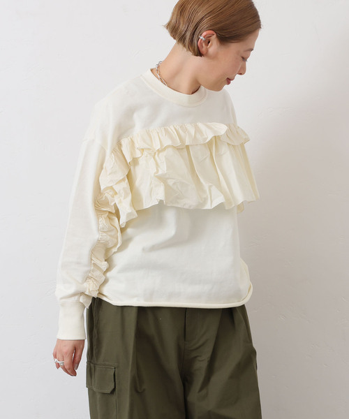 【2025AW】 journal standard luxe ◆再リク多数!異素材がポイント!タフタフリルプルオーバー 前身頃~袖まで一直線になったギャザーフリルがポイントのクルーネックプルオーバー。 ソフトで軽いコットン100%のミニ裏毛に、メモリータフタのフリルがついた異素材コンビがポイント。 裾は断ち切りのオーバーロック始末で軽く仕上げています。 ブラック、オフホワイト、ネイビー 全3色。FREEサイズ ※取り扱いについては、商品についている品質表示でご確認ください。 ※照明の関係により、実際よりも色味が違って見える場合があります。 またパソコン・スマートフォンなどの環境により、若干製品と画像のカラーが異なる場合もございます。 ※商品の色味は、商品アップ画像をご参照ください。 本体:手洗い可能