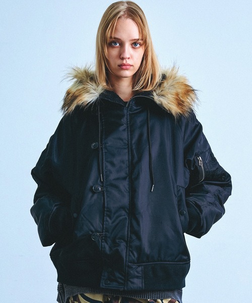 Revo. SELECTシンプルな見た目ながらもディテールやシルエットに拘ったN-2Bブルゾンアメリカ空軍が1960年代に採用した寒冷地用フライトジャケットN-2Bをベースに、現代的なシルエットに仕上げた1着。中綿入りで保温性が高く身体を優しく包み込む快適な着心地に。ゆったりとした身巾やアームホール、Y2Kを意識したショート丈のワイドシルエットがスタイリングに今っぽい遊び心を与えてくれます。存在感のあるファー付きフードは、ジップを開けるとセーラーカラーのようなディテールになりアクセントにもなります。ブラック、セージグリーンの2色展開。スラックス、革靴などと合わせてアダルトな雰囲気に、ダメージデニムパンツやカーゴパンツ、サイドラインパンツなどと合わせればトレンド感溢れるストリートコーデに仕上がります。カジュアルから綺麗めスタイルにと、様々なコーディネートに活躍してくれるアイテムです。・シンプルでありながら抜群の存在感・保温性とクッション性に優れた中綿入り・ワイドな身幅と着丈をやや短めに設定した旬なシルエット・ゆったりめのサイジングでインナーも着込めるサイズ感・被っても様になるボリューミーなフード・流行に左右されず、様々な着こなしに対応◎・細身のスキニーパンツやワイドパンツとも相性バッチリ・女性の方でも着用して頂けるユニセックスデザイン・旬な古着系ストリートスタイルにも◎COORDINATEシャツやロンTと合わせてライトアウターとして、パーカーやニットを着込んでアウター感覚でも幅広いシーンで活躍します。シンプルなデザインが幅広いアイテムと合わせやすく、デニムやチノパンを合わせたカジュアルスタイルから、パラシュートワイドパンツやトラックパンツと合わせたストリートスタイル、フレアパンツやスラックスなどと組み合わせた現代風なモードスタイルまで幅広く◎。また、寒さが厳しいシーズンは、中間着にカーディガンやGジャン、インナーダウン等を着用すれば、防寒性も高まり旬なレイヤードスタイルをお楽しみ頂けます。足元はスニーカーは勿論の事、ローファー、アンクルブーツ、レザーシューズなどの革靴で上品な雰囲気の合わせも◎。また、スタイルのアクセントとして、スマホショルダーやボディバッグ、巾着バッグ、バケットハット、サングラスなどの小物使いもおすすめです。STYLEカジュアル / ベーシック / ミリタリー / ストリート / アメカジ / ヴィンテージ / グランジ / 古着系 / 裏原系 / 韓国ファッション / Y2K / ジェンダーレス=================================≪お気に入り登録≫がおススメ!▶商品のお気に入り登録(ハートマークをクリック)完売カラーの再入荷通知や、在庫ラスト1点の通知、セールの通知を受け取ることができます。▶ブランドのお気に入り登録新商品がUPされたり売り切れ商品が再入荷したときなど、いち早くブランドのお得な情報を受け取ることができます。=================================※撮影画像はサンプル品を使用しているため、実際の商品と仕様、加工、サイズが若干異なる場合がございます。また、可能な限り実物に近いカラーにて掲載していますが、使用しているパソコンのモニター設定や、携帯電話のメーカー・機種により実際のカラーと異なって見える場合がございます。予めご了承ください。