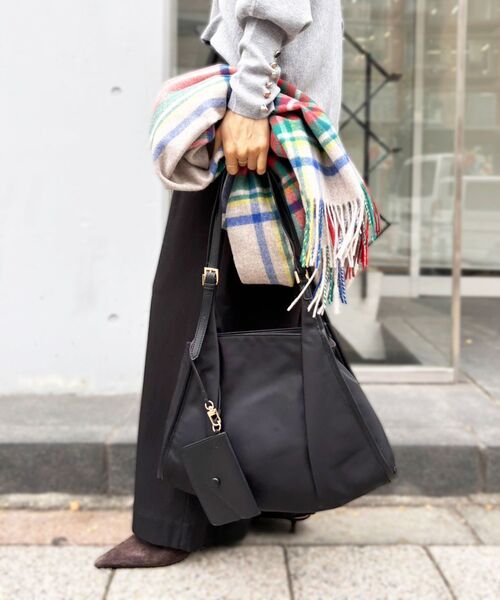丸みのあるデザインと、ベルトハンドルがアクセントになったナイロンバッグ。●ポイントハンドルの長さが調整でき、ハンドバッグや肩掛けとしてシーンに合わせてお使いいただけます。●おすすめコーデ軽量で丈夫なナイロン素材を使用し、普段使いからお出かけまで幅広く活躍するアイテムです。[ポーチ]タテ9cm/ヨコ13.5cm