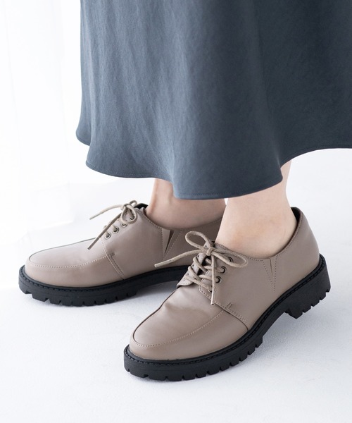 定番デザインのレースアップマニッシュをトラックソールでトレンド顔にアレンジ。程よい厚みのソールなので美脚見せを叶えつつ安定感があり、歩きやすさも◎ 履き口内側にVカット+隠しゴムを入れているので脱ぎ履きがしやすいのも嬉しいポイント。 オールシーズン大活躍間違いなしのアイテムです。 ※撮影は室内で行われており、ライティングにより実物と色味が少し異なる場合がございます。